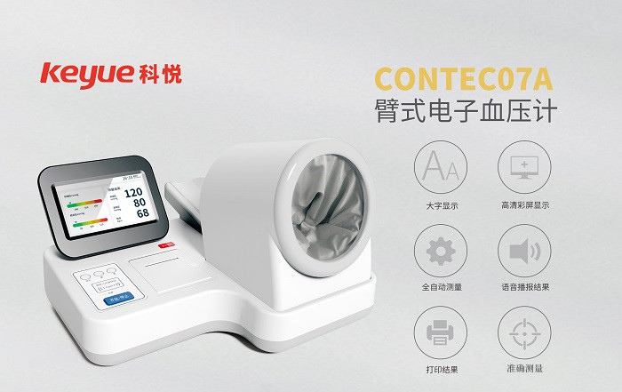 CONTECO7A臂式电子血压计,高清彩色液晶屏显示,界面简洁大方。适用于成人无创血压测量。无需手动捆绑袖带,使用者可单独操作设备完成测量。适用人群广泛,臂围在17 cm ~ 42 cm的人群适用;可语音播报测量结果,可打印测量结果。广泛应用于医院及各种医疗机构。